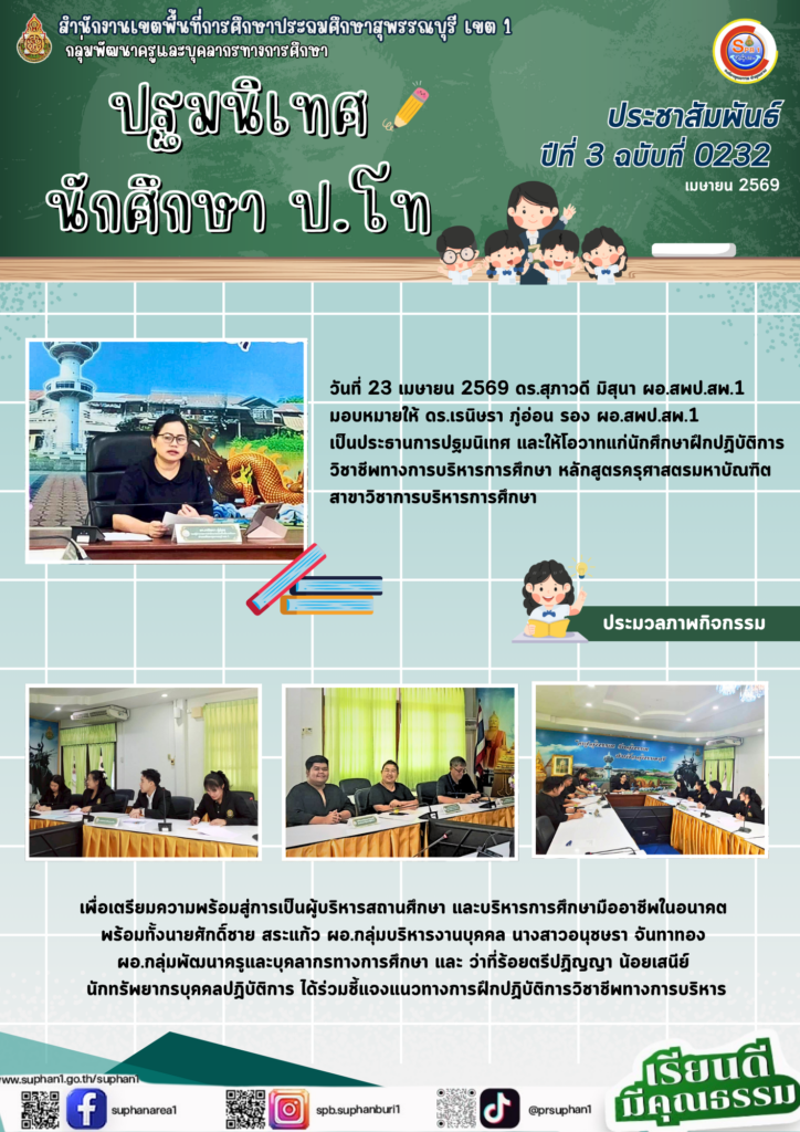 ดร.สุภาวดี มิสุนา ผอ.สพป.สุพรรณบุรี เขต 1 มอบหมายให้ ดร.เรนิษรา ภู่อ่อน รอง ผอ.สพป.สุพรรณบุรี เขต 1 เป็นประธานการปฐมนิเทศ และให้โอวาทแก่นักศึกษาฝึกปฏิบัติการวิชาชีพทางการบริหารการศึกษา หลักสูตรครุศาสตรมหาบัณฑิต สาขาวิชาการบริหารการศึกษา เพื่อเตรียมความพร้อมสู่การเป็นผู้บริหารสถานศึกษา และบริหารการศึกษามืออาชีพในอนาคต พร้อมทั้งนายศักดิ์ชาย สระแก้ว ผอ.กลุ่มบริหารงานบุคคล นางสาวอนุชษรา จันทาทอง ผอ.กลุ่มพัฒนาครูและบุคลากรทางการศึกษา และ ว่าที่ร้อยตรีปฏิญญา น้อยเสนีย์ นักทรัพยากรบุคคลปฏิบัติการ ได้ร่วมชี้แจงแนวทางการฝึกปฏิบัติการวิชาชีพทางการบริหาร