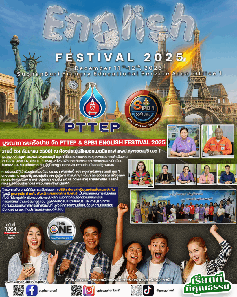 วันพุธที่ 24 กันยายน 2568 ณ ห้องประชุมสีหมอกเมฆนิลกาฬ สพป.สุพรรณบุรี เขต 1 ดร.สุภาวดี มิสุนา ผอ.สพป.สุพรรณบุรี เขต 1 เป็นประธานการประชุมวางแผนการดำเนินงาน PTTEP & SPB1 ENGLISH FESTIVAL 2025 เพื่อยกระดับทักษะภาษาอังกฤษของนักเรียนในสังกัด และขับเคลื่อนการเรียนรู้สู่มาตรฐานสากลผ่านความร่วมมือภาครัฐ-เอกชน